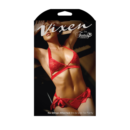 Wie sinnlich kann Unterwäsche sein? Wir glauben, dass dieses 2-teilige Set von Vixen Ihnen das definitiv bringt, und es wird auch einen unwiderstehlichen Eindruck auf Ihren Partner machen! Das Oberteil ist aus transparenter Spitze hergestellt und teilweise offen. Die breiten Satinbänder können am Rücken gebunden werden. Der passende Tanga in flammendem Rot vervollständigt den Look.