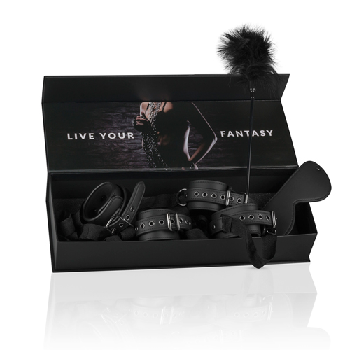 Interessieren Sie sich für Bondage, aber Sie wissen nicht, wo Sie anfangen sollen? Dann ist dieses Bondage-Fantasien Anfänger-Kit genau richtig für Sie! Es führt Sie in die Welt des Bondage ein und erlaubt es Ihnen, Ihre Fantasie einzusetzen, denn dieses Set kann in jeder von Ihnen gewünschten Weise verwendet werden. Das Set besteht aus Hand- und Fußgelenkmanschetten, einer Augenmaske und einem Kitzler. An den vier Manschetten sind Riemen angebracht, so dass Sie diese zusammenbinden oder an Bettpfosten, Stühlen, Bondagegeschirren etc. befestigen können. Die Möglichkeiten sind unbegrenzt! Die Augenmaske hüllt Sie in Dunkelheit, wodurch Ihre anderen Sinne für eine erregende Bondage-Erfahrung gesteigert werden. Aufgrund des elastischen Riemens passt diese Maske immer perfekt. Verwenden Sie den Kitzler, um Ihre/n Partner/in zu reizen und die Nervenenden zu stimulieren. Dadurch wird die Haut sogar noch empfindlicher und Ihrem Bondage-Spiel wird eine zusätzliche Dimension hinzugefügt.