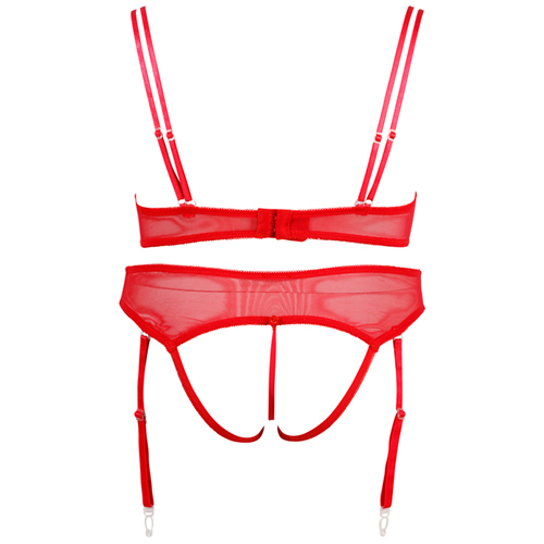 BH mit abknöpfbaren Spitzencups und zwei Paar Trägern. Ein Paar abnehmbar, das andere verstellbar. Hinten Hakenverschluss. Die leicht gefütterten Cups sind mit Pads unterlegt. String mit abknöpfbarem Spitzenteil vorn und hinten. Mit vier verstell- und abnehmbaren Strapsen. Rot. 90 % Polyamid, 10 % Elastan.