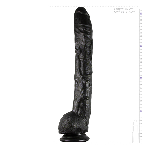 Diese wunderbare Riesenpenis ist absolut erstaunlich mit seiner Gesamtlänge von bis 42 cm. Mit einem Durchmesser von ca. 6 cm (Umfang über 19cm) und seinen Hodensack mit einem Durchmesser von 10 cm zeigt, dass dieser Gummiriese keine Wünsche offen lässt. Das Material ist weich und ermöglicht ein sanftes Eindringen. Der Schaft ist stark geadert, die Eichel und Hoden sind natürlich gehalten. Durch seine schwarze Farbe ist er ein Hingucker. Durch seinen Saugnapf ist er auf allen glatten Oberflächen zu befestigen, z.B. unter der Dusche oder auf einem Stuhl. Gewicht: knapp 1700 Gramm
