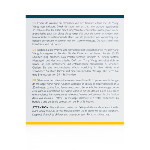 Genießen Sie eine wunderbare Massage mit dieser Massagekerze von Exotiq. Zünden Sie die Kerze an und genießen Sie den wunderbaren Ylang Ylang-Duft, der sich im Raum verbreitet.