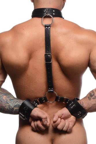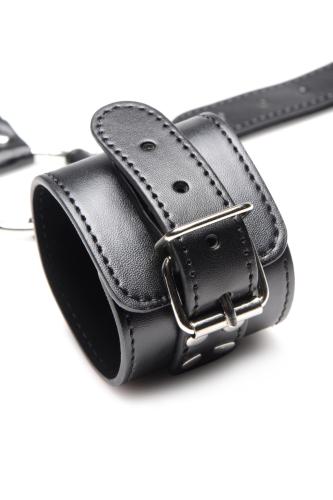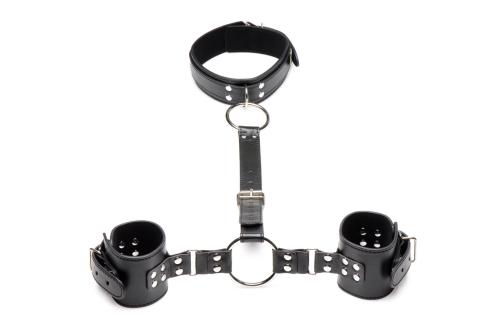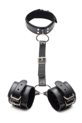 Fessle deinen Sub mit diesen Hals-zu-Handgelenk-Manschetten! Das weiche Innenfutter ist sanft zur Haut und sorgt für optimalen Komfort in jeder Position. Das vegane PU-Leder ist leicht zu reinigen und behält den sexy, klassischen Lederlook. Die großen O-Ringe sind aus stabilem, nickelfreiem Metall und können mit Bondage-Seilen, Ketten und anderen BDSM-Produkten bestückt werden. Das gesamte Set ist in weiten Bereichen verstellbar und passt sich so perfekt an jeden Körper an.