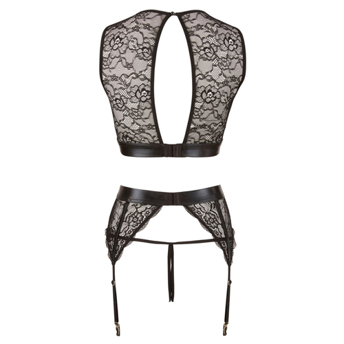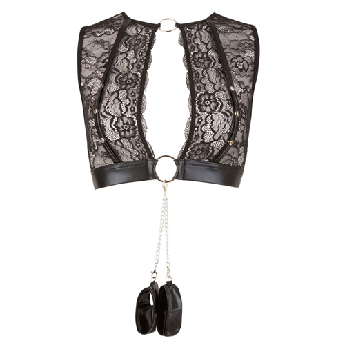 Top, Strapsgürtel und String ouvert im Mix aus transparenter Spitze und schwarzem Wetlook. Der Clou sind die schnell zu öffnenden Druckknöpfe über dem Busen und die Handfesseln mit Klettverschluss, die dank Karabinern an den Zierringen von Top und Strapsgürtel schnell ein- und ausgehakt werden können. So wird aus dem Wäsche-Set schnell ein besonderes Bondage-Set für Einsteiger!