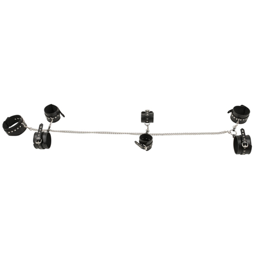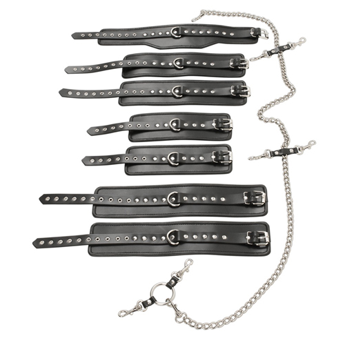 Dieses Gurtzeug ist alles was Sie brauchen! Es wird mit einem Kragen, Manschetten und einer Kette mit Karabinerhaken geliefert, die dafür sorgen, dass alles an Ort und Stelle bleibt. Das Set enthält 2 Bondage-Bänder, die am Handgelenk oder an den Knöcheln befestigt werden können. An den Oberarmen können zwei zusätzliche Gurte angebracht werden. Das Lederhalsband ist an den Manschetten und der Kette (1 Meter) befestigt. Alle Bänder sind verstellbar und angenehm zu tragen.