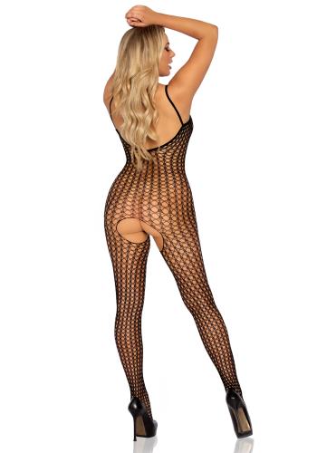 Dieser aufregende nahtlose Catsuit in Schwarz mit Trägern hat einen sexy offenen Schritt. Der Catsuit ist aus Häkelmaterial und somit leicht durchsichtig.