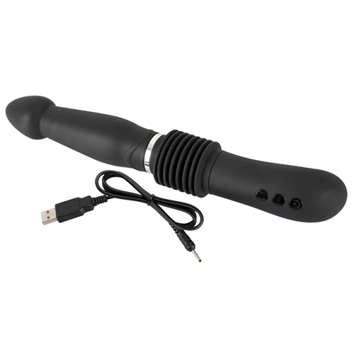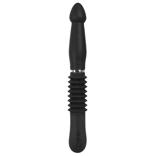 Analvibrator mit bauchigem Schaft, der sich unterhalb der konischen Spitze verjüngt, und Griff sowie intensiver Stoßfunktion. 7 Vibrationsmodi und 3 Stoßgeschwindigkeiten, getrennt steuerbar per Knopfdruck. Wiederaufladbar mit beiliegendem USB-Ladekabel. Schwarz. Gesamtlänge 30 cm, Einführtiefe 15 cm, Stoßhöhe 6 cm, Ø 2,8-4,1 cm. Silikon, ABS, PU, phthalatfrei gemäß EU-Verordnung 1907/2006/EC.