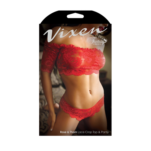 Schulterfreies Oberteil und passender String aus durchsichtiger Spitze. Mit Blumenmuster