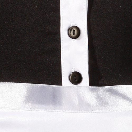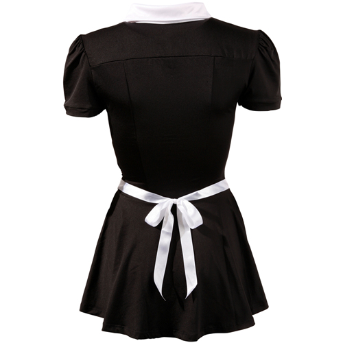 Schwarzes Minikleid mit weißem Kragen, Knopfleiste mit Spitzen-Verzierungen am Dekolleté. Mit dazugehöriger weißer Schürze, die am Rücken zu binden ist. Minikleid: 90% Polyester, 10% Elasthan. Schürze: 100% Polyester.
