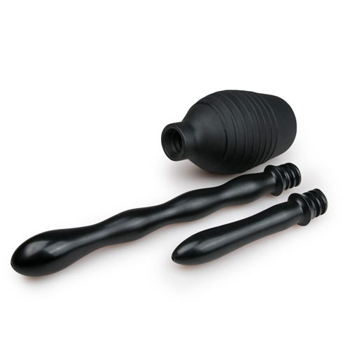 Schwarze Intimdusche (13 cm hoch, Fassungsvermögen 300 ml) mit zwei austauschbaren Schraub-Aufsätzen mit Spritzdüsen. Einfach zu reinigen.