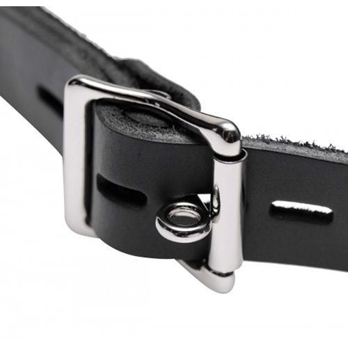 Spreizen Sie die Lippen Ihres/r Sub/s und öffnen Sie ihren oder seinen Mund in Erwartung Ihres Genusses! Dieser Mundknebel hat eine Öffnung von 3,8 cm Durchmesser an der Vorderseite. Die perfekte Größe, um allerlei Gegenstände annehmen zu können. Eine Schließe an der Rückseite hält das strenge Leder perfekt an der richtigen Stelle. Und wussten Sie, dass Sie auch einfach ein kleines Standardschloss hinzufügen können? Der Knebel ragt ein wenig in den Mund, lässt aber die Zähne und die Zunge frei, wodurch Ihr/e Sub in oraler Hinsicht vollkommen unter Ihrer Kontrolle steht! Der Knebel ist aus robustem Stahl und echtem Leder. Ein Stück Qualität, das für die Erfüllung Ihrer Fantasien gemacht wurde!