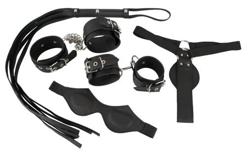 Das 5-teilige Bondage-Set im Leder-Look besteht aus Augenmaske, Hand- und Fußfesseln, Strap-on-String (Dildo nicht enthalten) sowie Peitsche und lädt zu intensiven Lust-Sessions ein. Vegan.